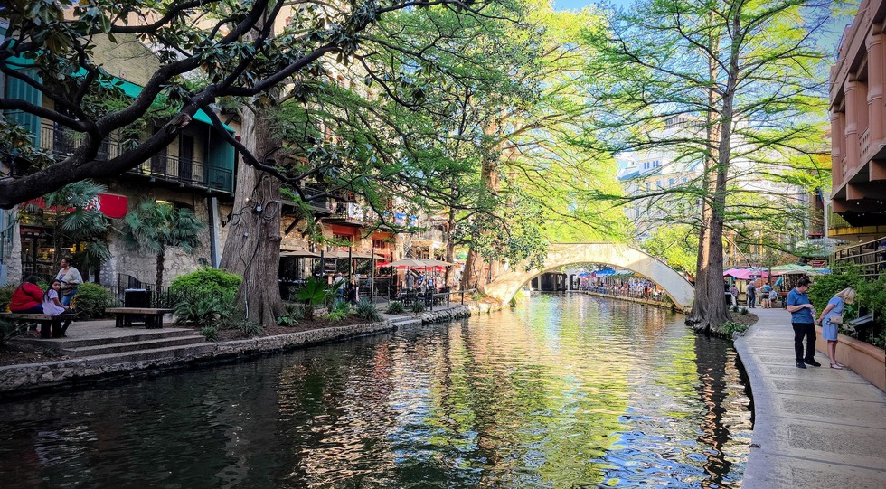 The River Walk winds and loops under bridges as two parallel sidewalks lined with restaurants and shops, connecting the major tourist draws.