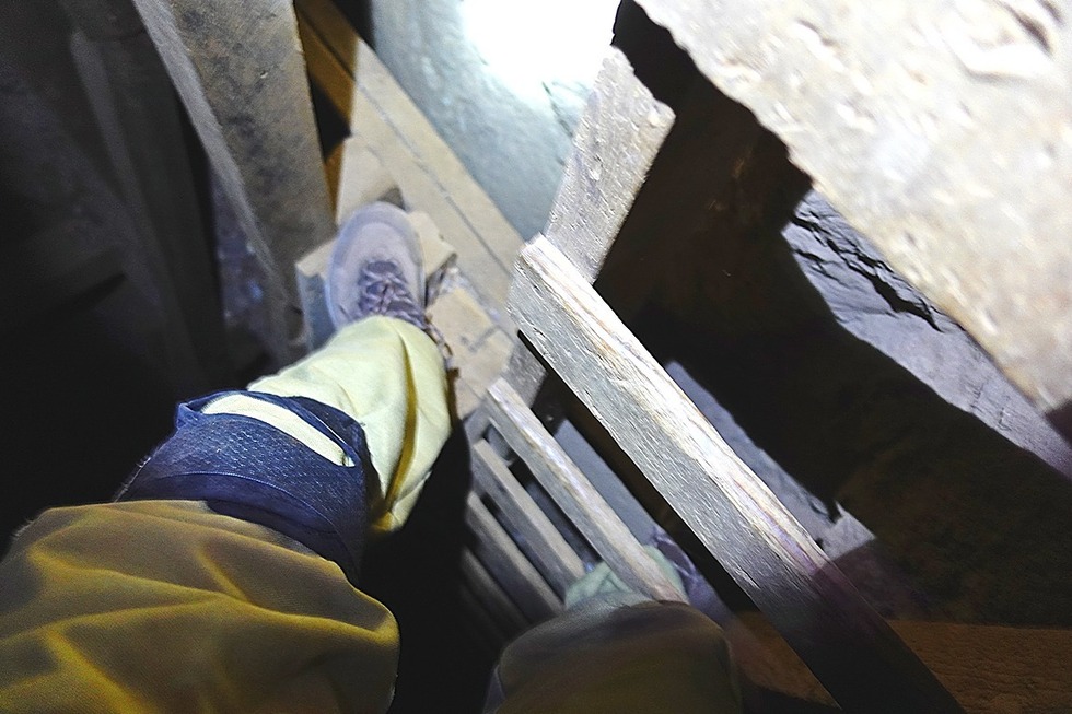 Ladder etiquette, I am resting here at a cross beam as I go up. Never have both feet on the same rung, keep to the outside or near the ladder anchor. These ladders were good but not as confident building as the ones that have the rungs notched in. Never lean out! Always test before starting the next group, make sure are anchored to wall.