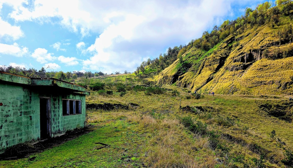 The old road peters out near an old blockhouse, now lacking doors and windows, which offers shelter to livestock on the ranch here. Off to one side is an old quarry, which cuts into the side of the hill.