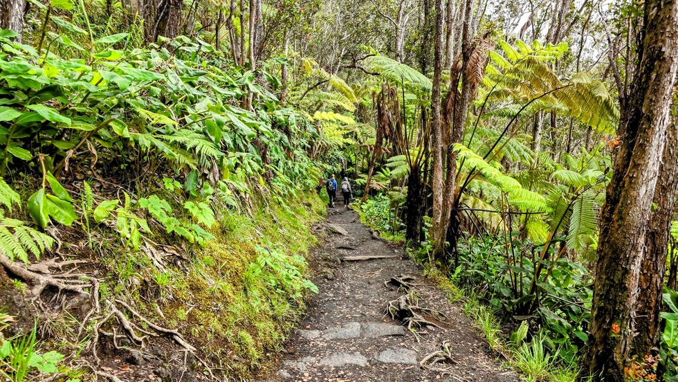 On the way down, there is an abundance of ferns known as the hapu’u pulu distinguished by their three feather-like divisions or tri-penate formation. And of course, I am surrounded by the `ohi’a, the most abundant tree in the forest, holding on to its red lehua blooms. There are several bends in the trail helping me to make my way down to the caldera floor.