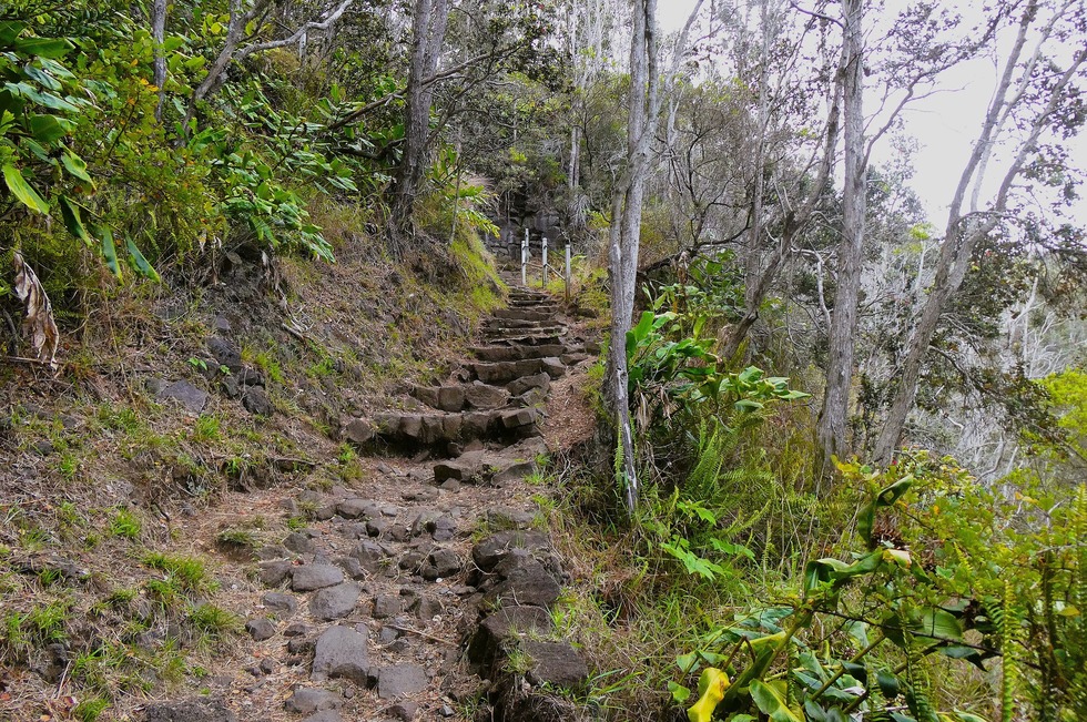 Spared by the 1959 eruption, this forest has been subjected to other destructive forces—non-native plants and animals. Downwind from high lava fountains, forests suffered tremendous damage. Trees were stripped of leaves and branches—or completely buried—by falling cinder. Prevailing trade winds blew most of the cinder away from here, sparing this forest from the eruption. Protecting it from invasive flora and fauna has required human intervention.