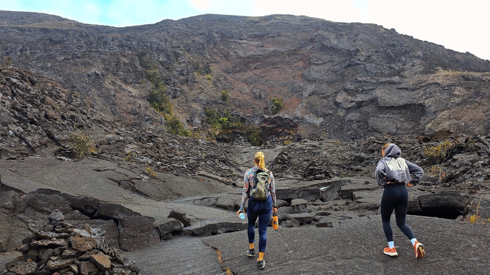 Walking toward Pu‘u Pua‘i (gushing hill), did not exist prior to 1959. The reddish-brown cavity at the base of this cone was the main vent from which lava erupted. Imagine lava shooting five times higher than Pu‘u Pua‘i is tall. Three days before the eruption ended, lava surged 1,900 feet above the vent—a record for the highest fountain ever measured in Hawai‘i.