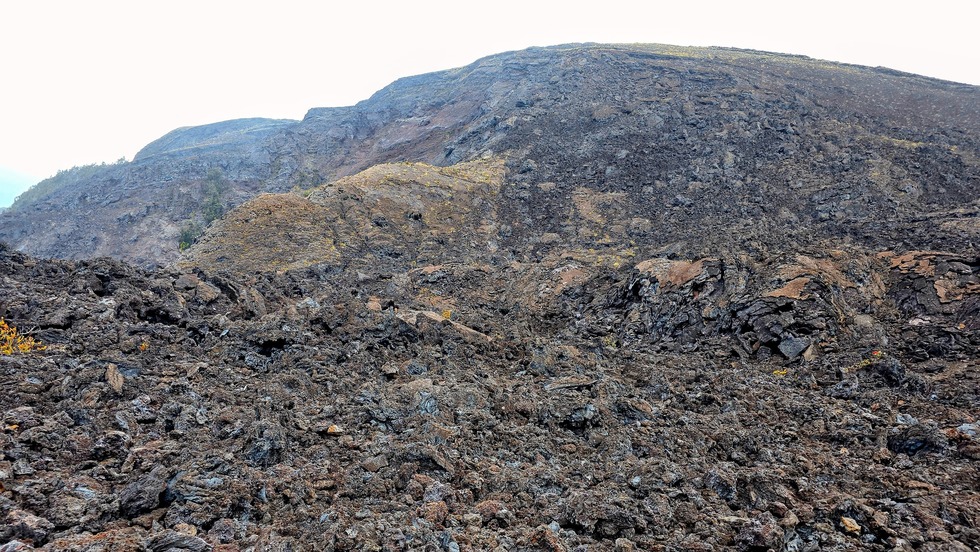 slump scars near the top of the cinder cone, produced when “slabs of congealed spatter … pulled by gravity” broke loose and slid down the cone, creating groove marks during the process. Notice the bright red and muted purple colors created from oxidation of iron minerals within the rocks.