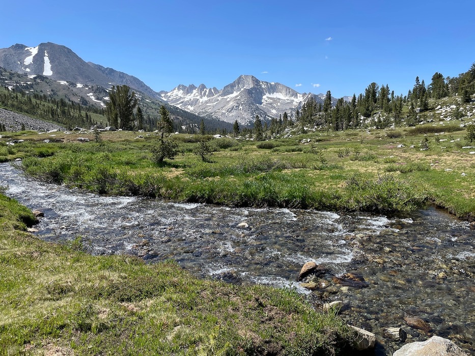 One of several creek crossings. Mt Conness in the distance.