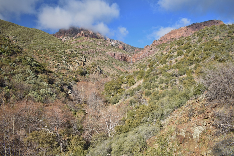 Started from Collum Spring. There's a parking area and campsite right next to the creek. There's an old road that runs parallel to the creek on the south side before breaking away. Saved some time avoiding the creek for a little, then there's no choice but to climb out on the north side. It's loose and brushy, but there are clear, grassy lines through a lot of it.