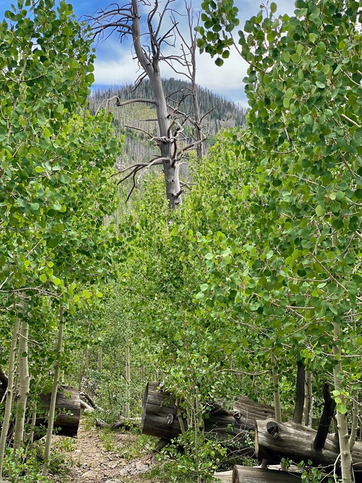 Kendrick Lookout in the distance as the trail wanders through a thick stand of aspens.