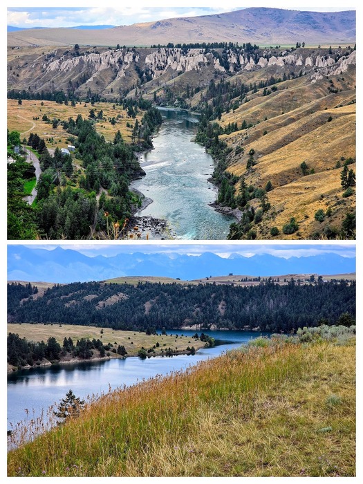 Top photo is looking down river to the west. Bottom photo is upstream as it flows from Flathead Lake. Mission Mountains in the background.