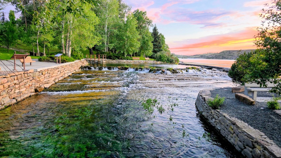 Today, some of the spring water is bottled annually for human consumption and some of the discharge is used for a trout hatchery (behind where I'm standing). The hatchery is a Montana state trout hatchery named Giant Springs Trout Hatchery and raises mostly Rainbow Trout. The spring serves as the headwaters of the 200-foot (61 m)-long Roe River, once listed as the shortest river in the world according to Guinness Book of World Records.