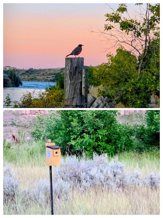 The image shows a birdhouse, likely a bluebird box, which is a type of nest box designed to attract cavity-nesting birds.