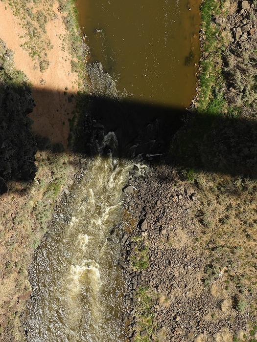 The river beneath the bridge and the bridge's shadow. It's quite a drop. Probably higher even than the Navajo Bridge over the Colorado.