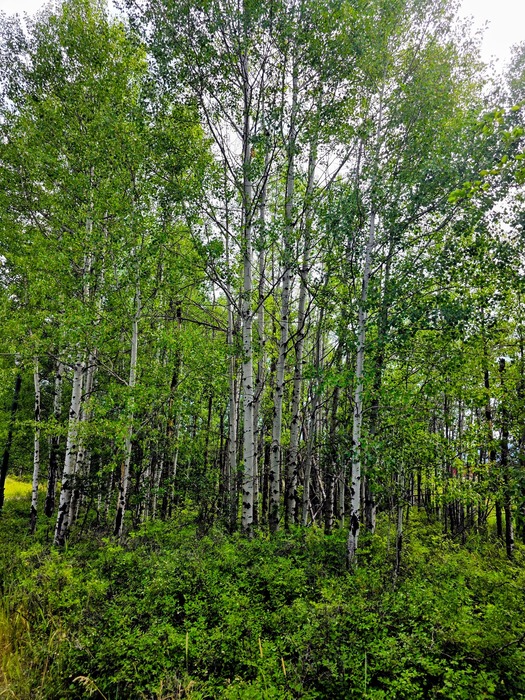 Some birch trees identifiable by their distinctive white bark and slender forms. These are likely Silver Birch (Betula pendula) trees on the northside of the route on the other side of the railroad tracks.