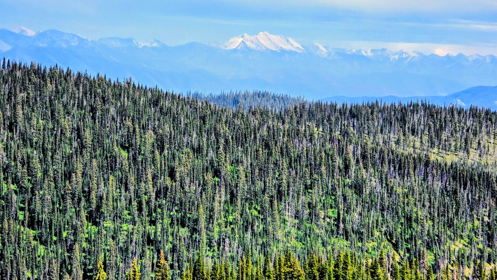 Topographic relief is significant as the west aspect rises 5,100 feet (1,600 meters) above Hungry Horse Reservoir in four miles, and the east aspect rises the same in five miles above the Middle Fork Flathead Valley. This climate supports the Stanton Glacier on the north slope.