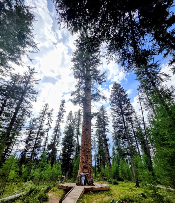 The tree is part of the James Girard Memorial Tamarack Grove, a 60-acre old-growth forest dedicated to James W. Girard, who had a special appreciation for Western Larch trees.