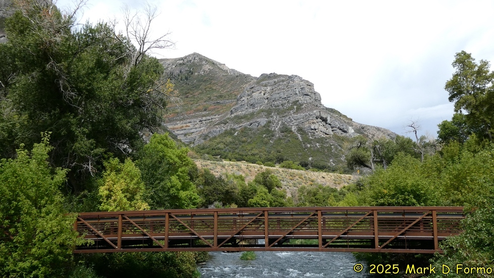 A bridge over the Provo River and the lower slope of Mount Timpanogos.