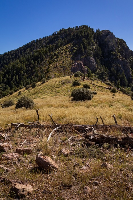Looking up the N facing slope of Pine from the saddle separating 88Mac