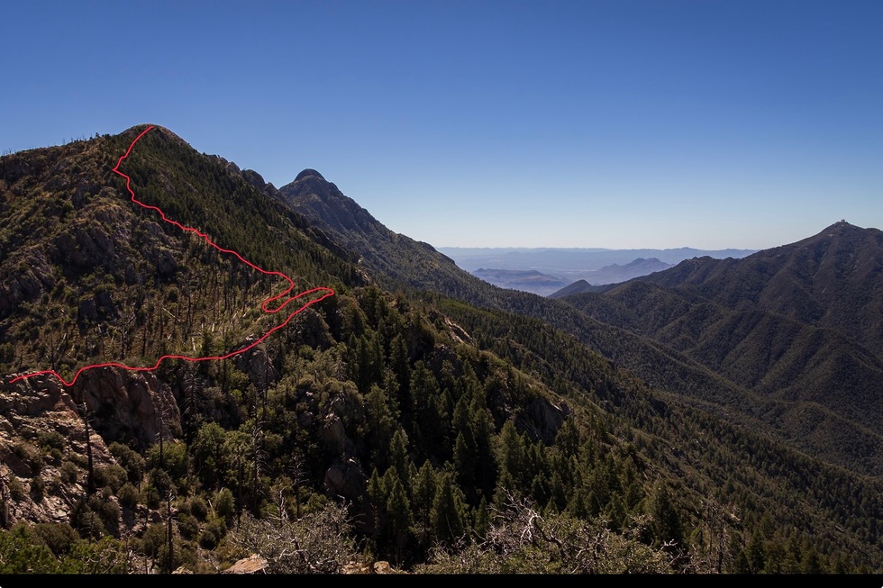 Roughly the route up the N slope of 88Mac from McCleary. The mid ground switchback line is actually a descent to that saddle than a climb up. The mid ground is small peak between McCleary and the Mac which hides where the Four Springs trail crests the ridge. Armour spring and Florida peak are out of frame left.