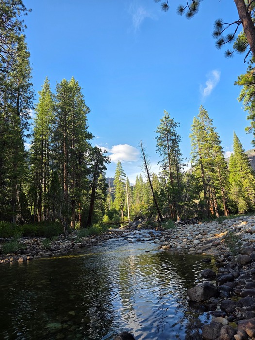 Tuolumne river near campsite on day 1. Foot bridge is in the background.