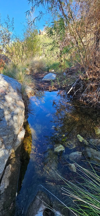 A bit of flow, a large pool above a peaty bog, then (fortunately downstream) a cow pie. Pretty agile cow to get this far up the canyon.