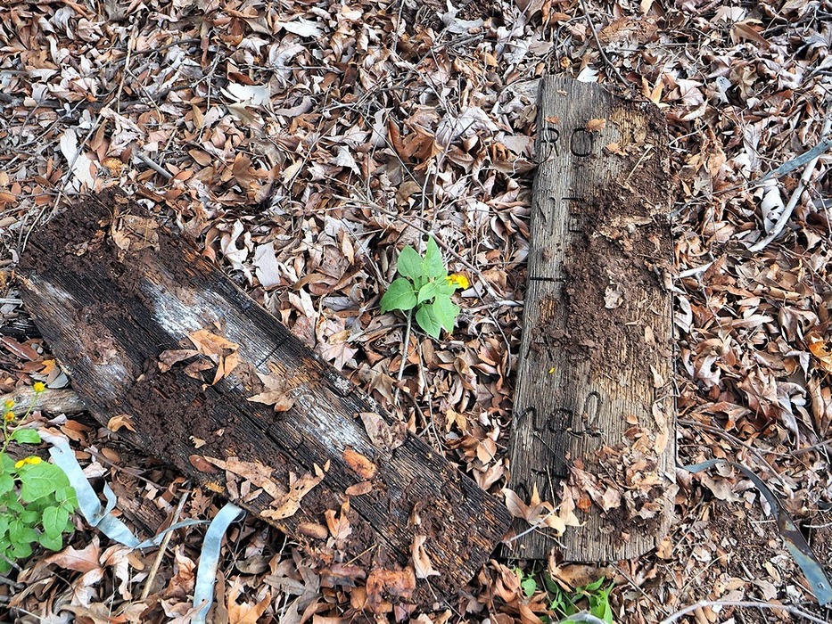 Parts of the Wilderness sign moldering in the leaves