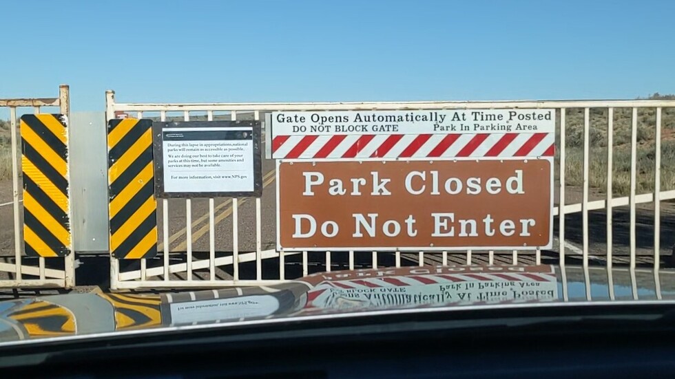 Next day, I planned to walk around in Petrified Forest National Park. I waited outside the South gate 10 min past opening time, the drove 40mi to the North entrance (pictured). Apparently the fine print about the Gov shutdown is keeping PEFO closed.