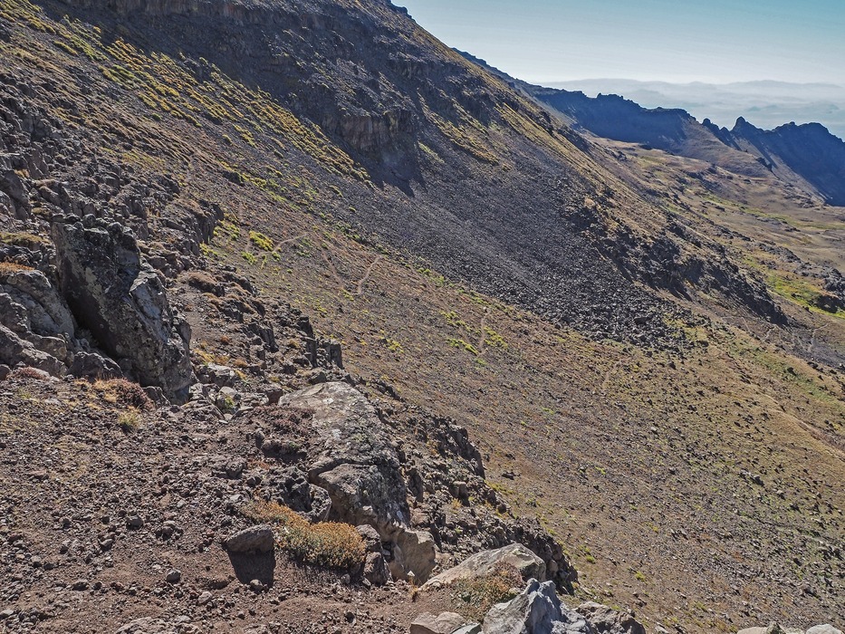 Photo showing the switchbacks going down the steep slope towards the lake.