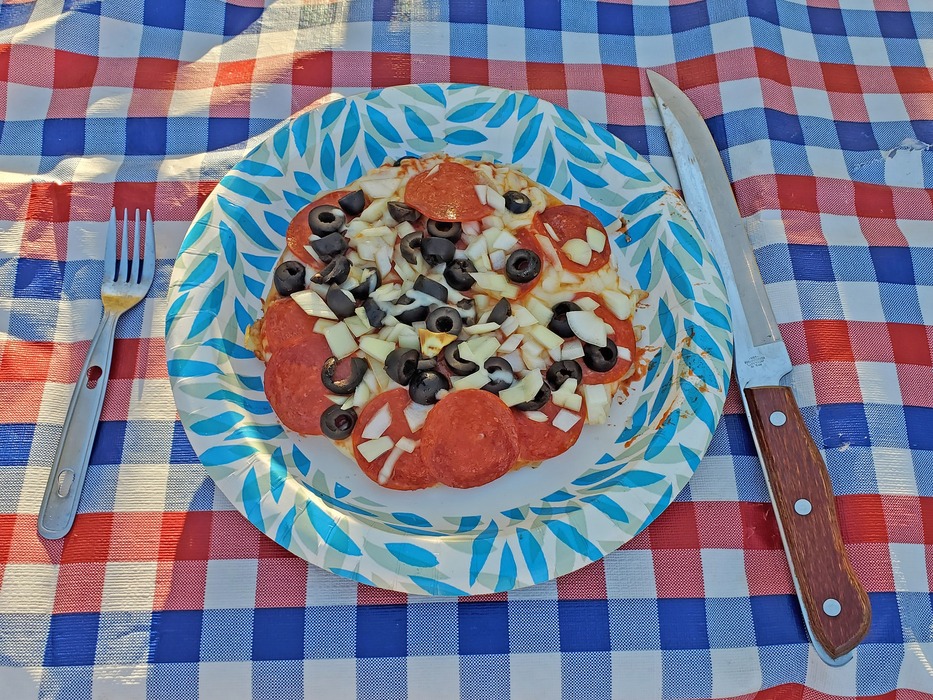 Pan fried pepperoni and olive pizza for dinner. A new camping favorite.