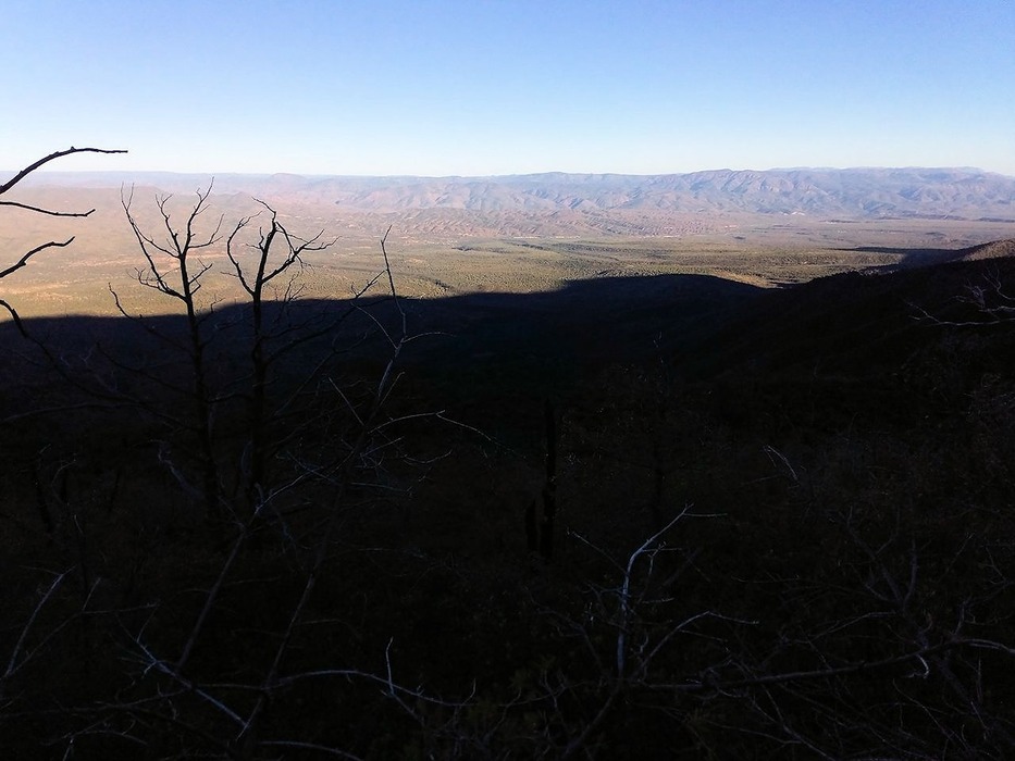 The view looking west as you climb. (Good cell service. Even at the Falls, surprisingly, even tho surrounded by rock.) As evening approached, you could see diffraction in the shadow of the mountain tops, making their shadows fuzzy. (You can see it starting in this photo.)