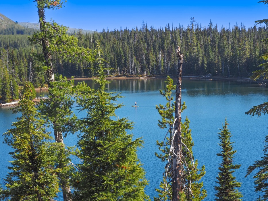 A paddle boarder cruises across the West end of Big Lake. Campsites are hidden in the trees.