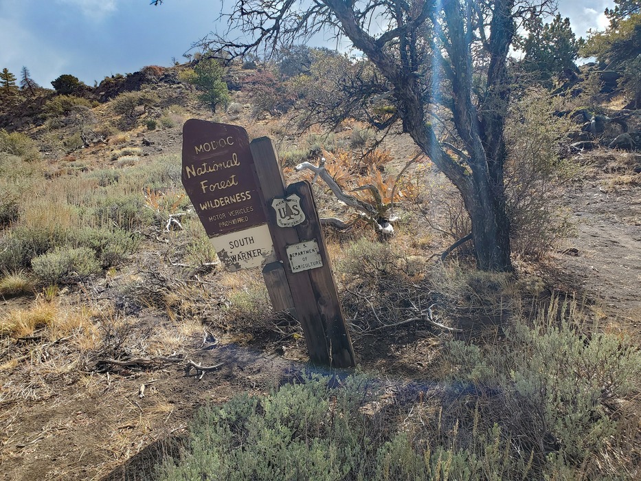 Entering the South Warner Wilderness. Not sure if the signpost is tilted or the camera was tilted.