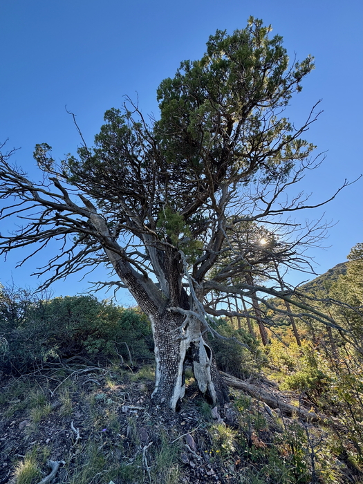 This gnarly juniper had burned. Tough to capture, but I could walk clear through the base of the trunk. And yet it was alive and thriv... ok, well, it was alive. Impressive.