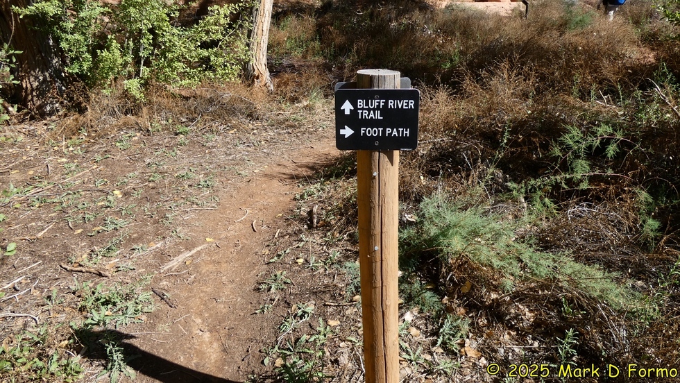 Sign along the Bluff River Trail. On this day, roughly 90% of the 'Foot Path' was rendered impassable due to the high level of the San Juan River, running at 1910 cfs. 74.66° F