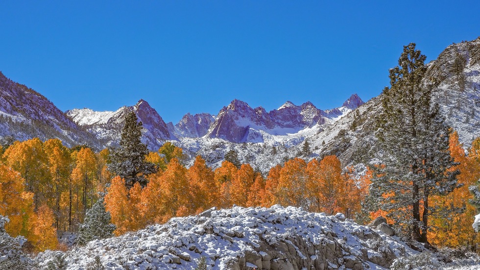 View of the mountain peaks surrounding Sabrina Lake Basin from Hwy 168, aka Sabrina Lk Road.