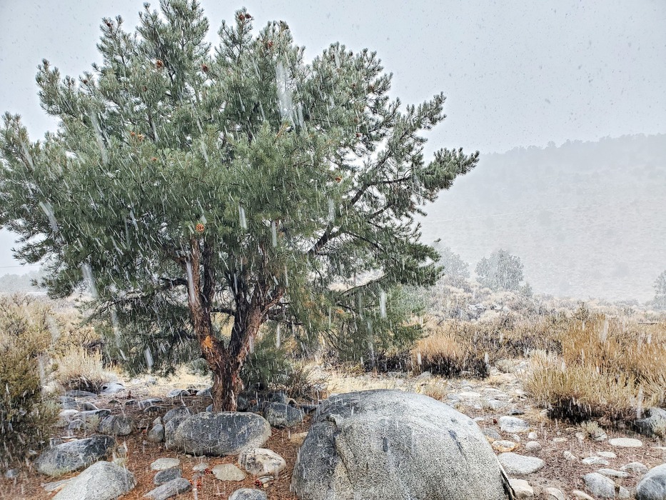Snow falling at my campsite in the Bitterbrush Campground on Tuesday afternoon, Oct 14. I spent most of the day sitting in my car reading a book.
