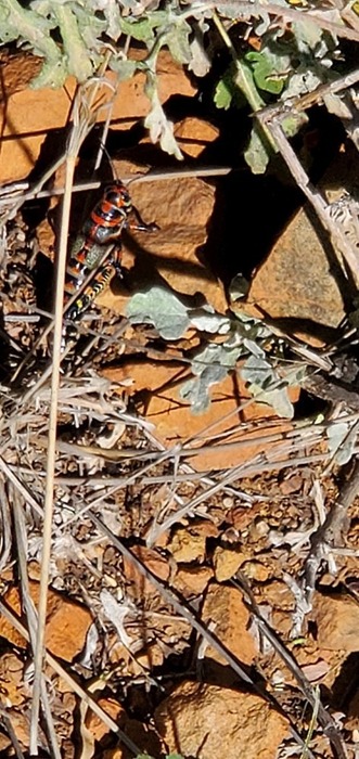 grasshopper with black, green, red, orange, yellow, etc.
