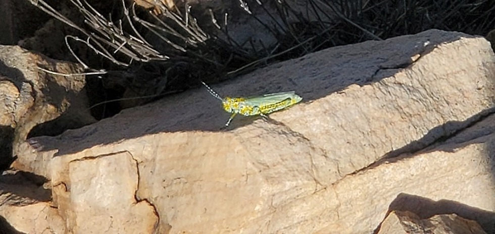 colorful green and yellow grasshopper, differently colored than others seen recently.