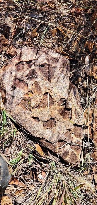large rock with smaller rock imprints. someone must have taken the time to pound out or pry out all of those smaller rocks.