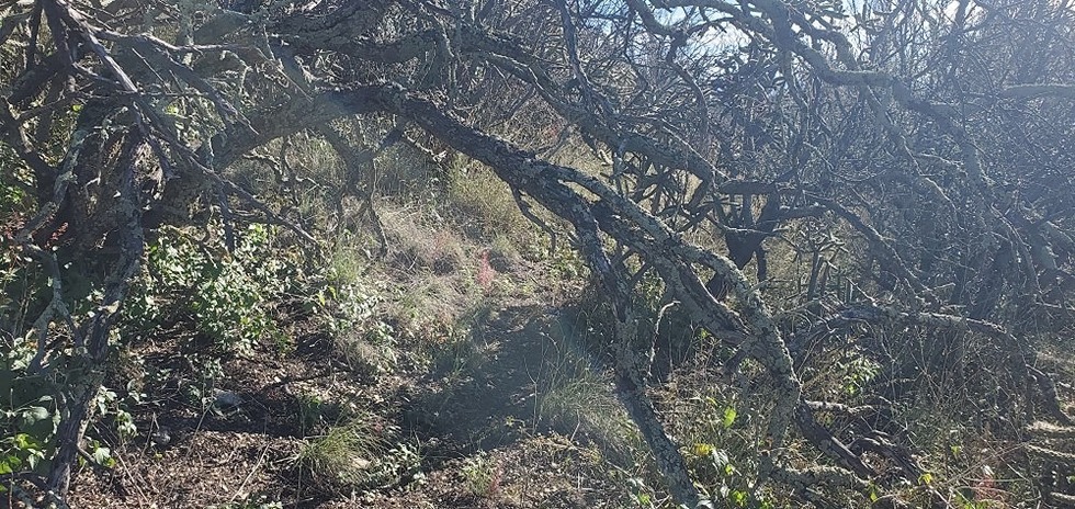 The trail is very overgrown in here. The trail appears to go under a low branch and then seems to dead end.