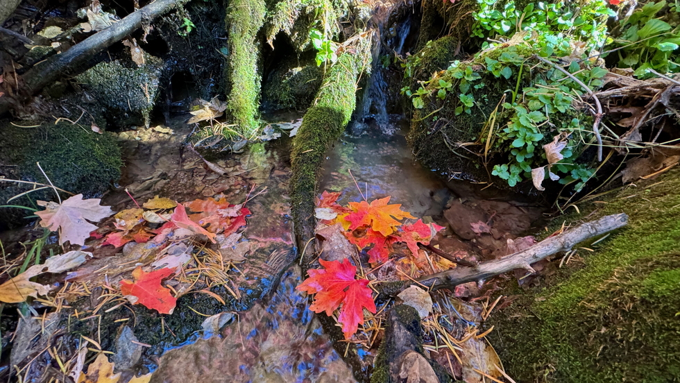Upper See Spring gushes from the mountainside. It is well above the location marked on the map.
