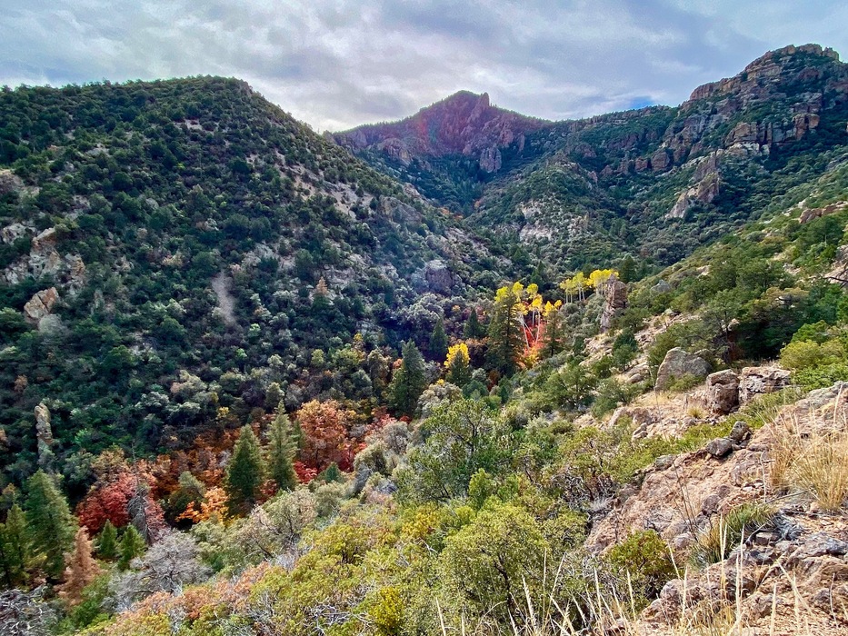 the sun was not in a great spot, making for some weird lens artifacts looking up at Basset with the pocket of fall color below