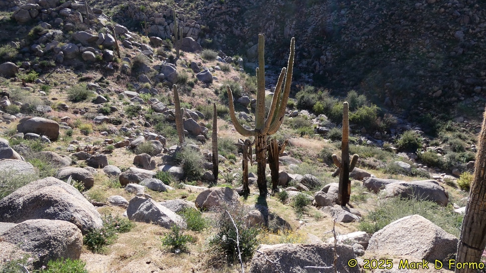 Dead/burned Saguaros along Ballantine Trail #283. 75.02° F