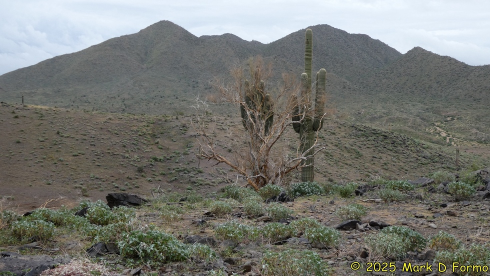 A burnt Palo Verde, two Saguaros and the Stewart Mountains. 62.42° F