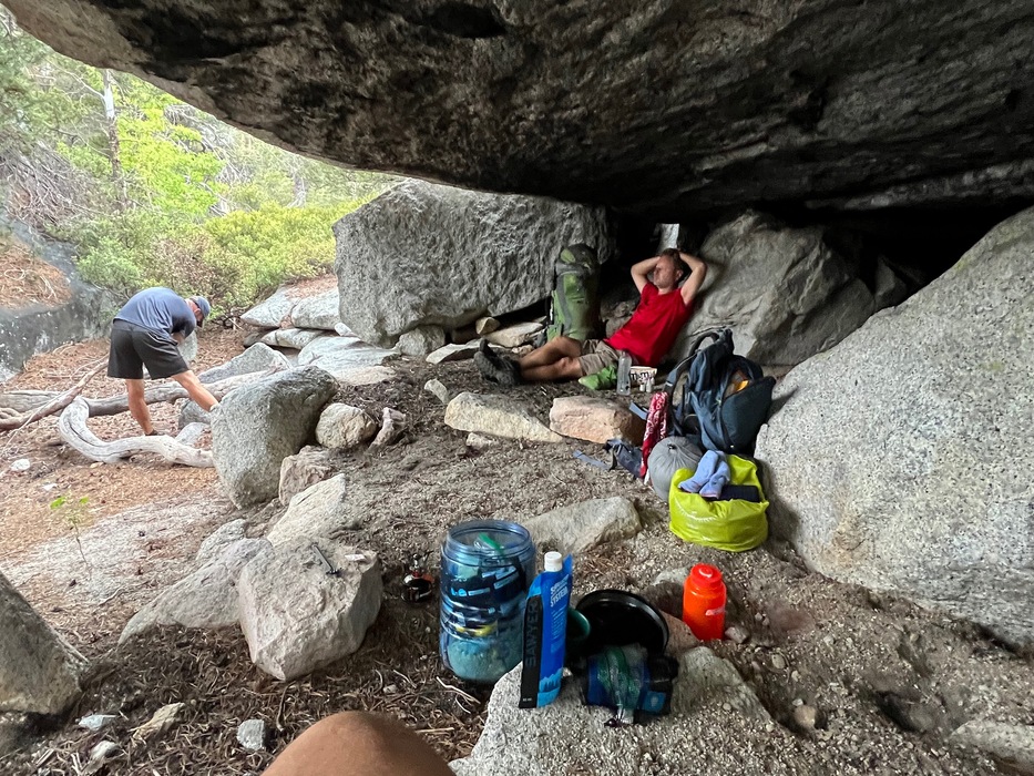 We took a break at this overhang by Washburn Lake as a storm rolled in and dropped some rain. Our timing was perfect
