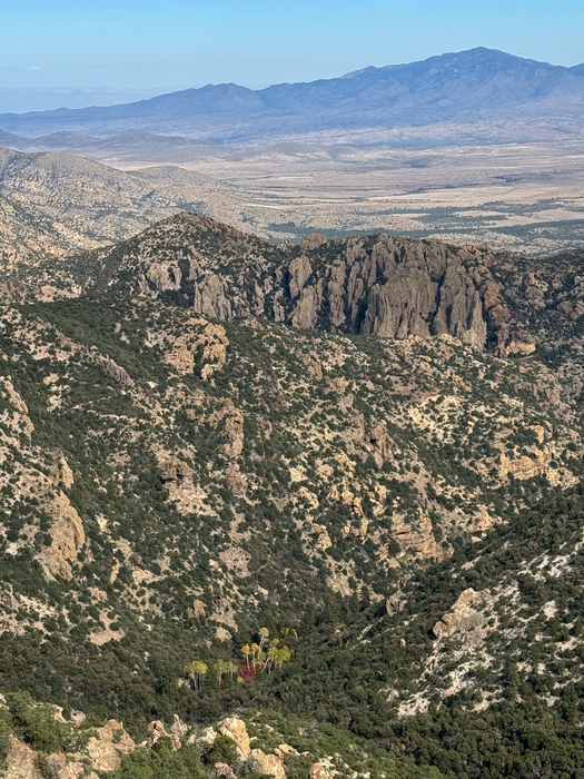Switchbacks up from the aspen area in the canyon below, with West Peak in the Pinalenos across the valley.