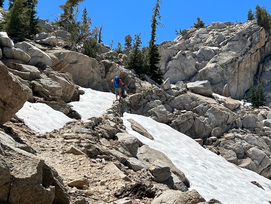 More snow as we near the top. Notice the trail construction Chumley is walking on