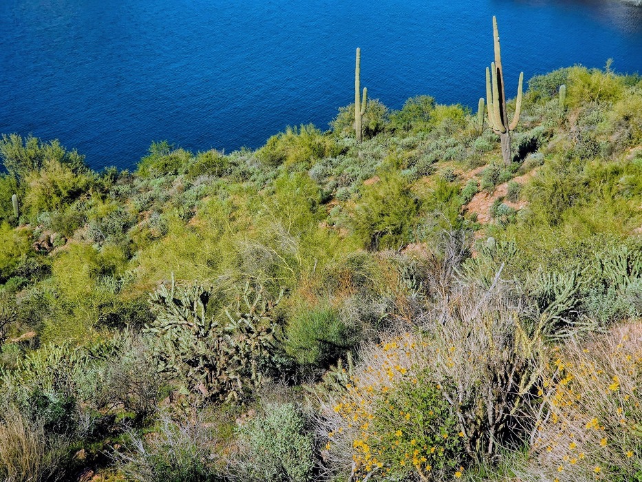 What I was trying to show you here were the prolific blooms on the Brittlebush but it didn't quite work. Still, the colors are pretty and you can see how green it is; especially against the blue of the lake water.