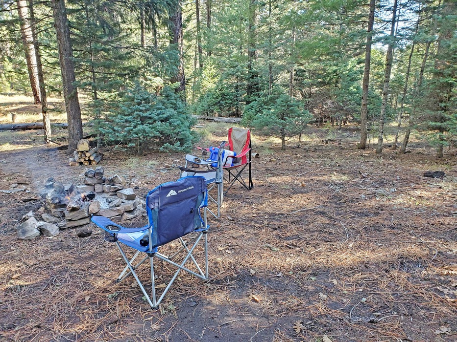 The fire pit in camp. My grandson used a hand saw to cut off about a half dozen or more long dead 5-6 foot tall fir trees scattered around the campsite which we burned over 2 days. They've been an ugly eyesore for several years. About 4 were in this view. Note that he left the live ones.