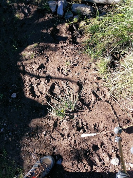 Hmmm... three sets of different animal tracks in the soft dirt. (Can be only a few days old.)