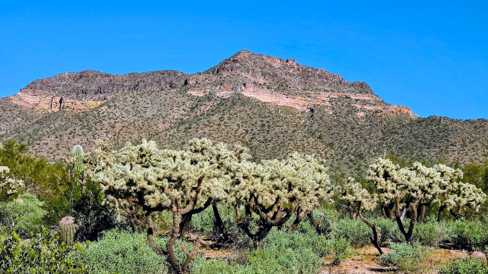 Healthy cholla looking toward Pass Mountain.