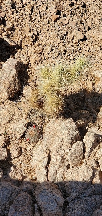 teddy bear cholla and a fishhook cactus below it