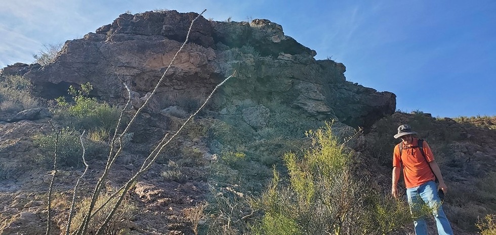 in front of the rock formation, trying to decide which way is best to proceed